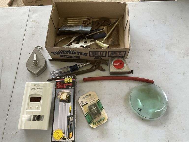 LOT 114 - Tools, CO detector, magnifying glass, etc