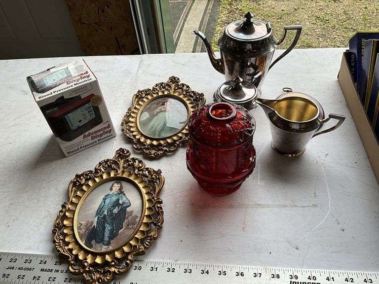 monitor, silver tea pot, etc