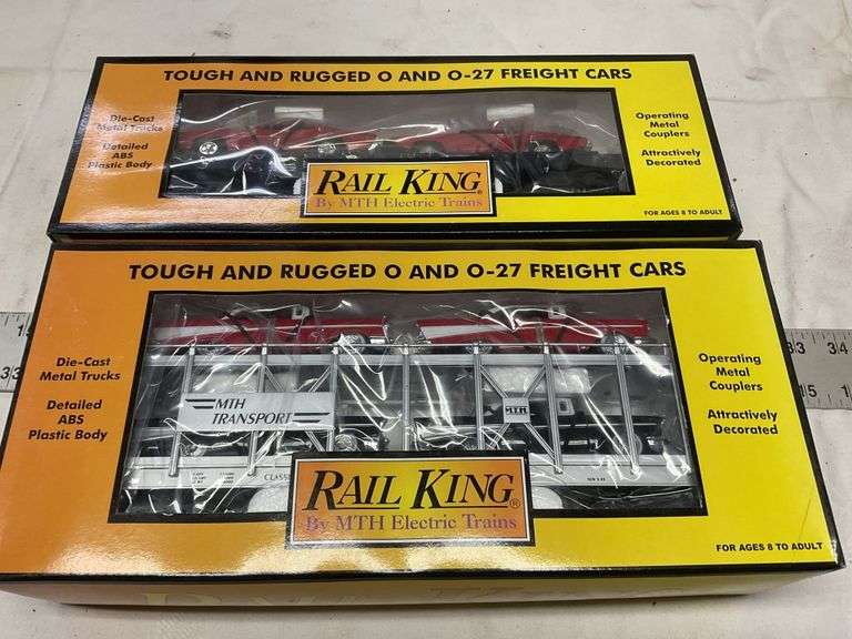 LOT 527 - Rail King Auto transports with Ertl vehicles NIB